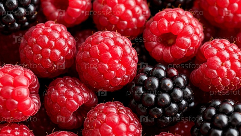Ягоды малины и черники сложены вместе на заднем плане