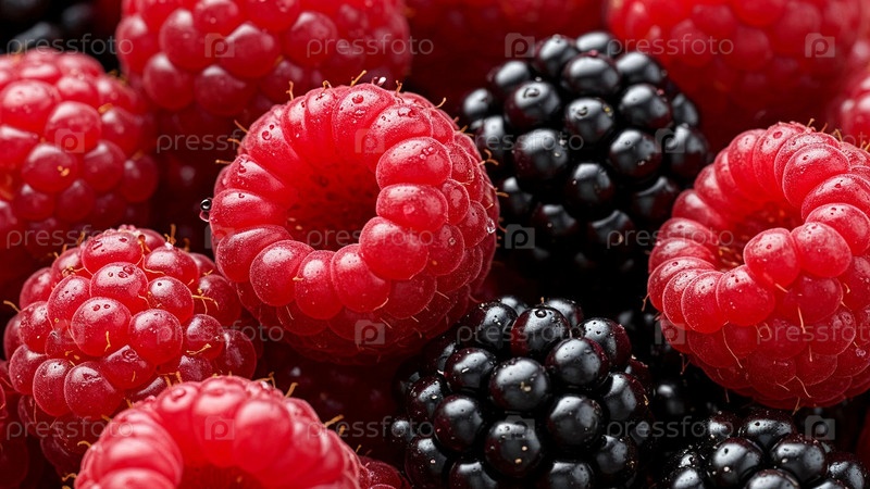 Черная ягода и красные малины лежат вместе на близком расстоянии