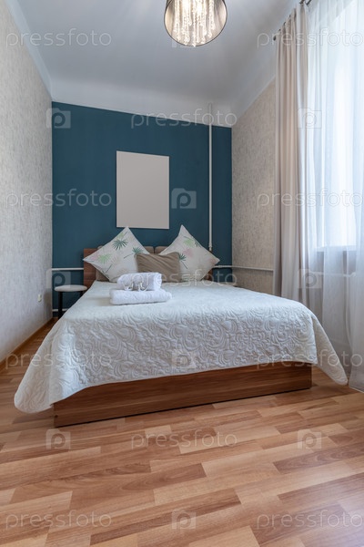 Яркая минималистическая спальня с синим акцентом стены, белое постельное белье, деревянный пол и мягкий дневной свет, создавая спокойную и расслабляющую атмосферу