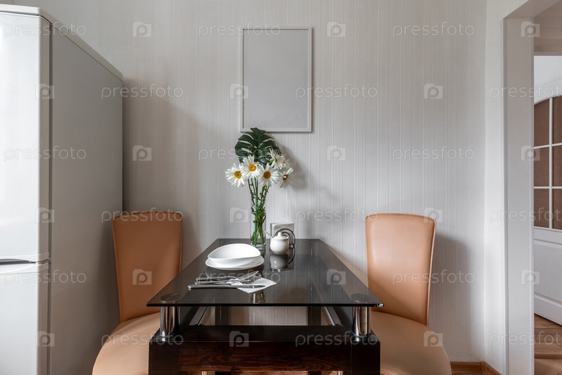 Яркая минималистическая кухня - обеденная комната со стеклянным столом, бежевыми стульями и вазой маргариток, создающая чистую и уютную внутреннюю атмосферу