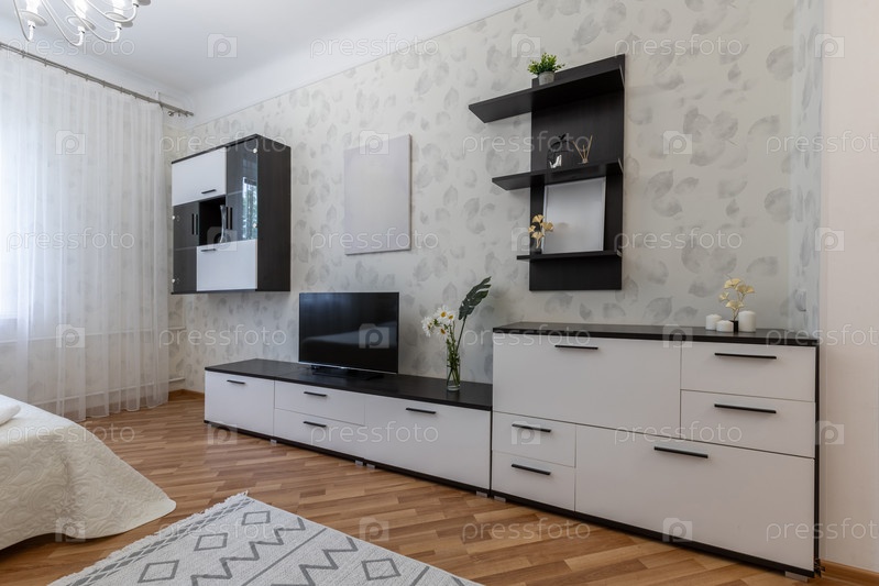 Современный интерьер гостиной с телевизором и черно-белыми мебелью