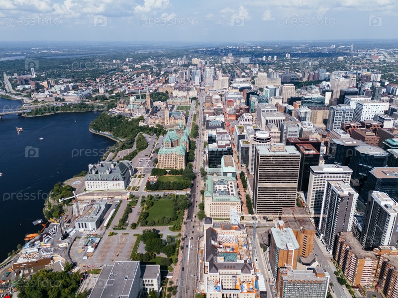 Вид с воздуха на горизонт центра Оттавы, включая здания парламента в Оттаве, Онтарио, Канада
