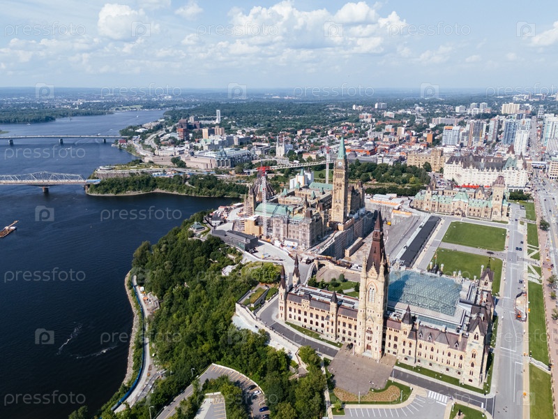 Вид с беспилотника на канадский парламент, Парламентский холм, Палату общин и Восточный блок в центре Оттавы и реку в солнечный день, Канада