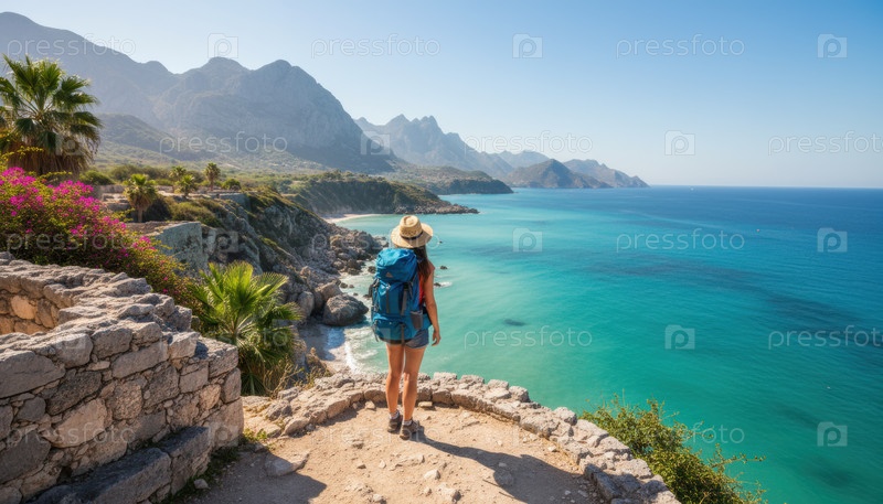 Путешественник смотрит на бирюзовое побережье с горами вдалеке, символизирующими страсть к странствиям, свободу и призыв к средиземноморским приключениям