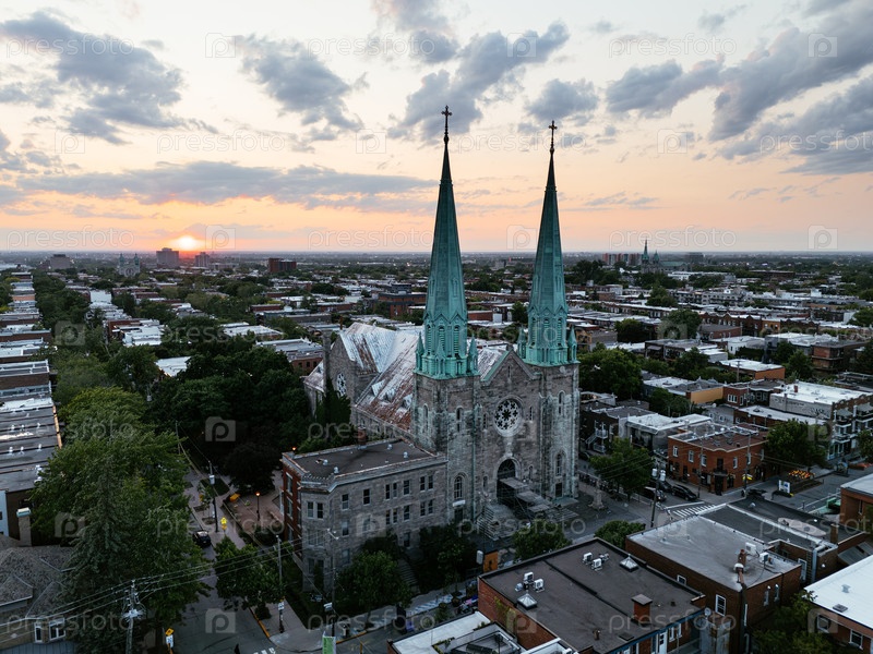 Вид с воздуха на закат церковных шпилей над городским пейзажем Монреаля