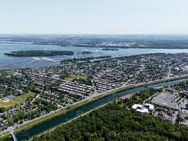Вид с воздуха на окрестности Вердена, Лачинский канал и горизонт Монреаля летом