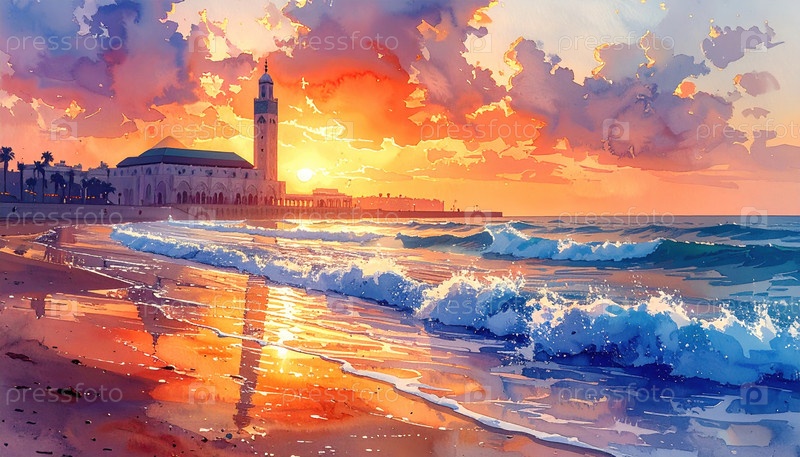 Яркий закат солнца над большой приморской мечетью вызывает темы духовного путешествия, культурных туристических тенденций и вечных размышлений о глобальных прибрежных направлениях
