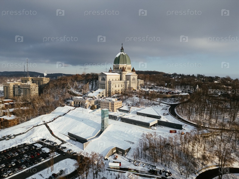 Вид с воздуха Оратория Святого Иосифа на горе Королевской во время захода солнца зимой.Монреаль, Квебек, Канада