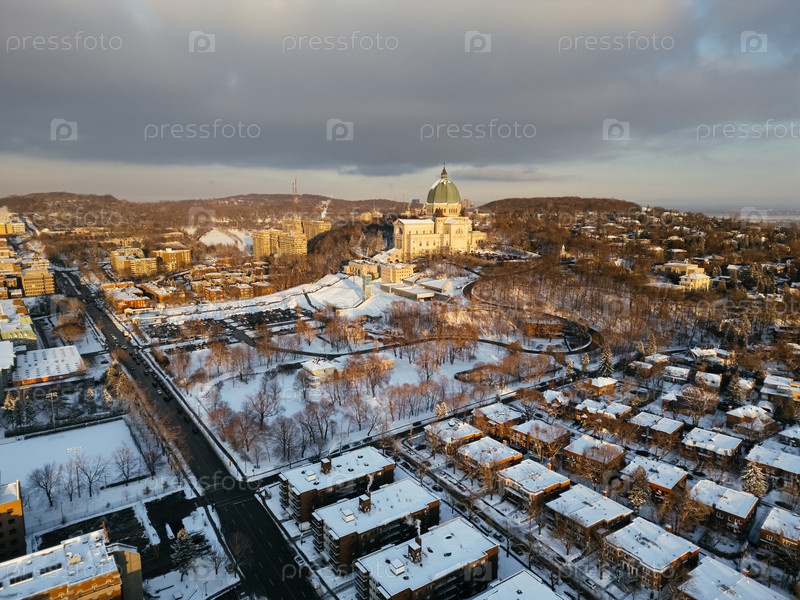 Вид с воздуха Оратория Святого Иосифа на горе Королевской во время захода солнца зимой.Монреаль, Квебек, Канада