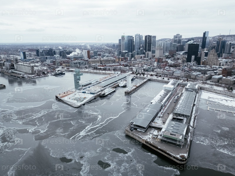 Зимний вид на прибрежный берег Старого Порт-Сити с развлекательной зоной.Монреаль, Канада