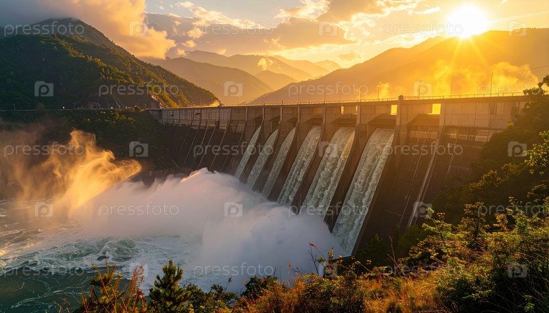 Гидроэлектростанция, которая выпускает воду на рассвете в горной долине, символизирует возобновляемую энергетику и гармонию между технологией и устойчивостью природы