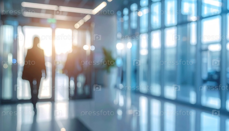 Люди, проходящие по современному офисному лобби на рассвете, отражают деловую мобильность, тенденции корпоративной культуры, эволюцию удаленной работы и постоянное движение, формирующее глобальную профессиональную среду