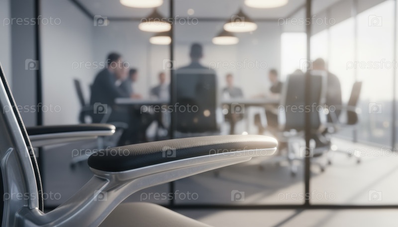 Подлокотник офисного стула на переднем плане конференц-зала выражает корпоративную атмосферу планирования сотрудничества или деловой дискуссии в современном рабочем пространстве
