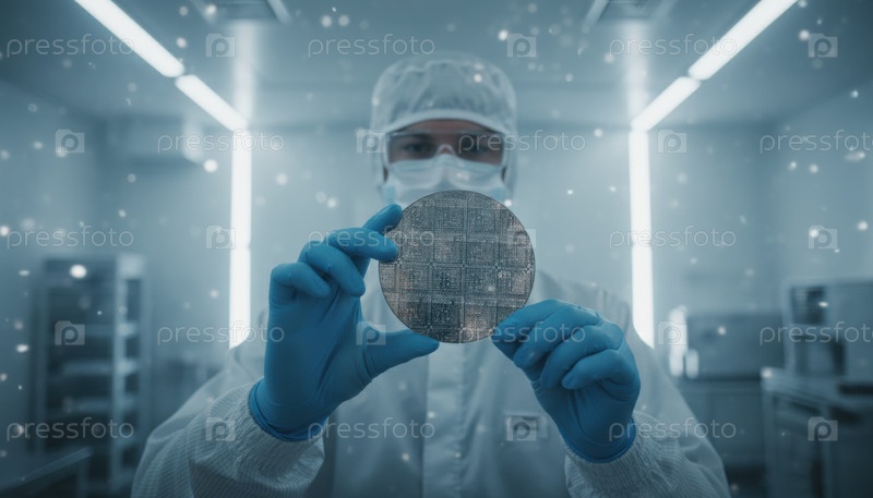 Ученый из стерильной лаборатории, держащий кремниевую пластинку, символизирует прогресс в исследованиях полупроводников, высокоточном производстве и глобальной гонке за инновационными чипами