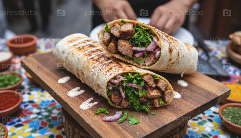 Жареный оберток, наполненный мясом и травами, захватывает оживленную атмосферу уличной еды и непринужденной столовой рынка