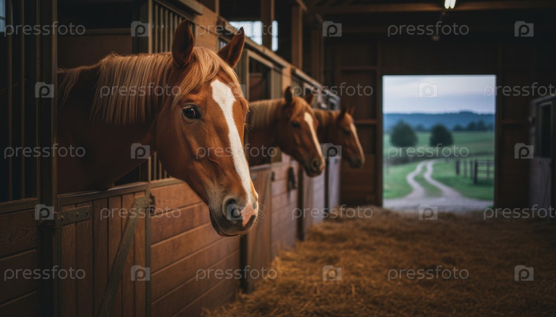 Лошади смотрят с стабильной сельской фермы, символизируя сельский мир, заботу о животных и крепкую связь между людьми и природой
