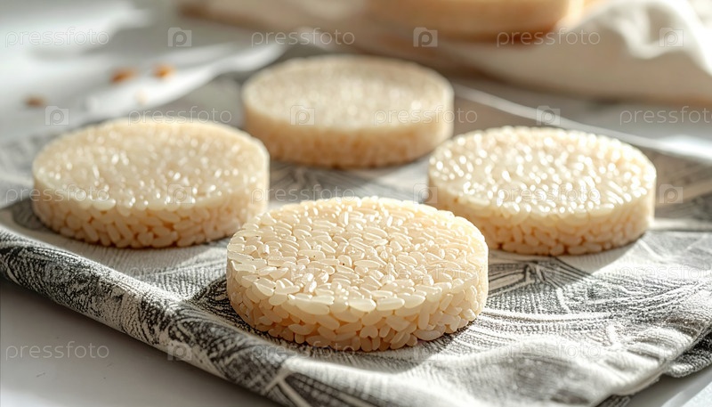 Круглые рисовые торты аккуратно расположены на салфетке под солнечным светом, представляя собой простоту, тенденции здорового питания и культурную оценку минималистической эстетики пищи