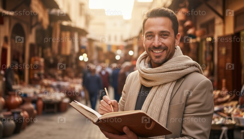 Человек пишет в журнале на оживленной улице рынка, представляя идеи культурного открытия, личное размышление и глобальные туристические тенденции, подходящие для повествования или контента образа жизни