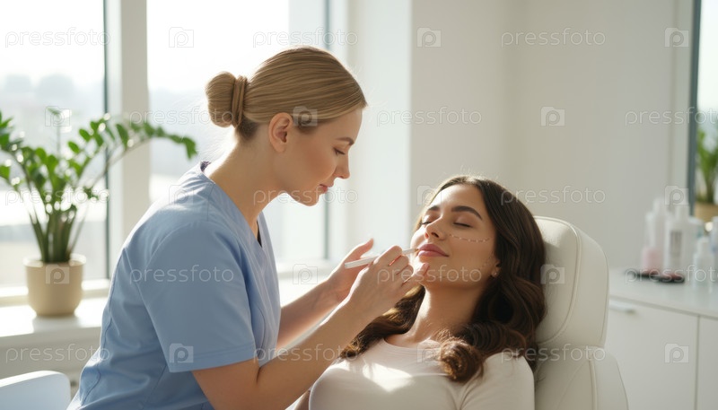 Женщина-врач и пациент, сцена косметической процедуры, символизирующая современные тенденции красоты и личный уход в яркой клинике