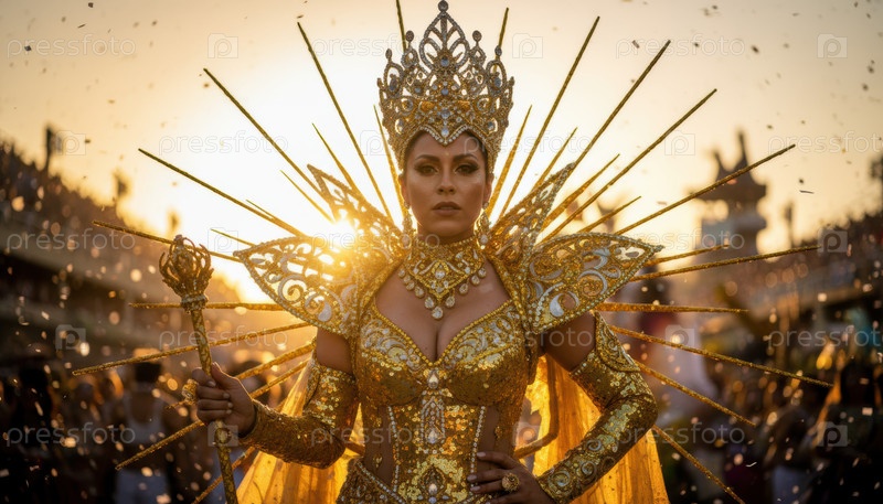 Женщина в золотом костюме во время карнавального парада, символизирующего праздник, роскошь, радость и культурную гордость под сияющим закатом