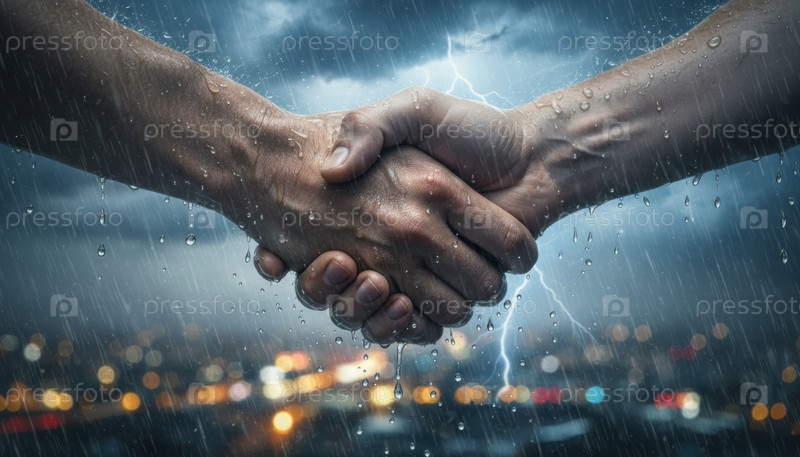 Две руки, пожатые друг другу во время грозы, символизируют устойчивость, единство, командную работу и сильные партнерские отношения, сформированные даже в сложных и непредсказуемых обстоятельствах