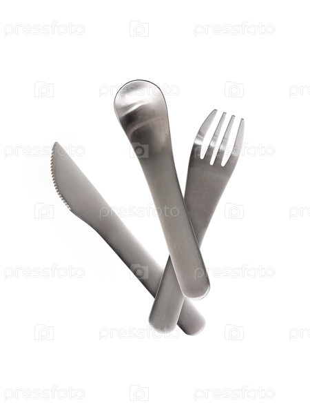 Металлическая ложка и вилка изолированы на белом фоне