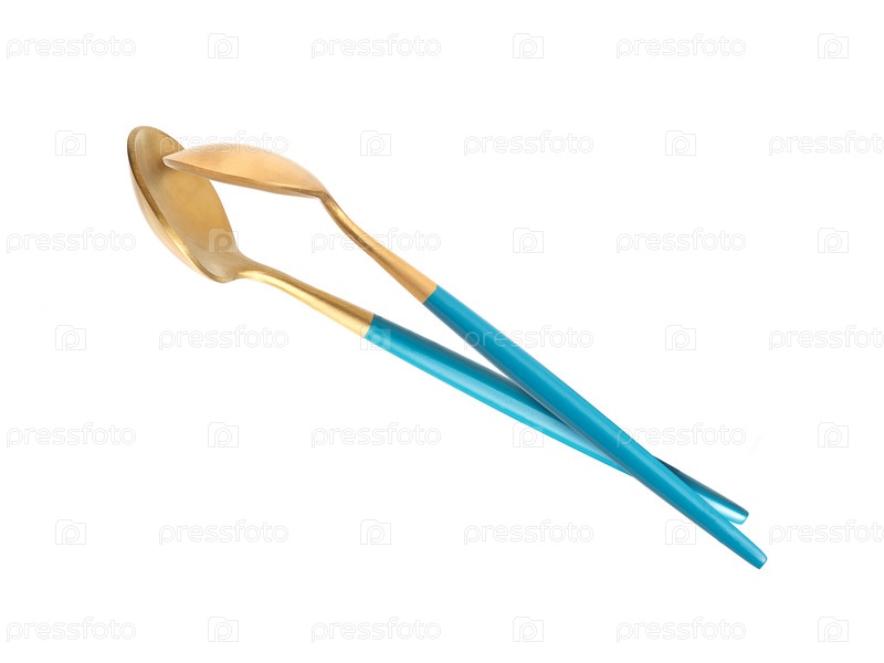 Красивая золотая чайная ложка с бирюзовой ручкой, изолированной на белом фоне