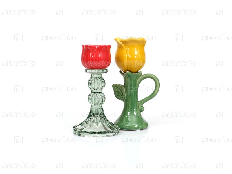 Две современные желтые и красные керамические светильники тюльпанов с зеленым стеблем и петлевой ручкой, стиль домашнего декора изолированный на белом фоне, готовый вырез