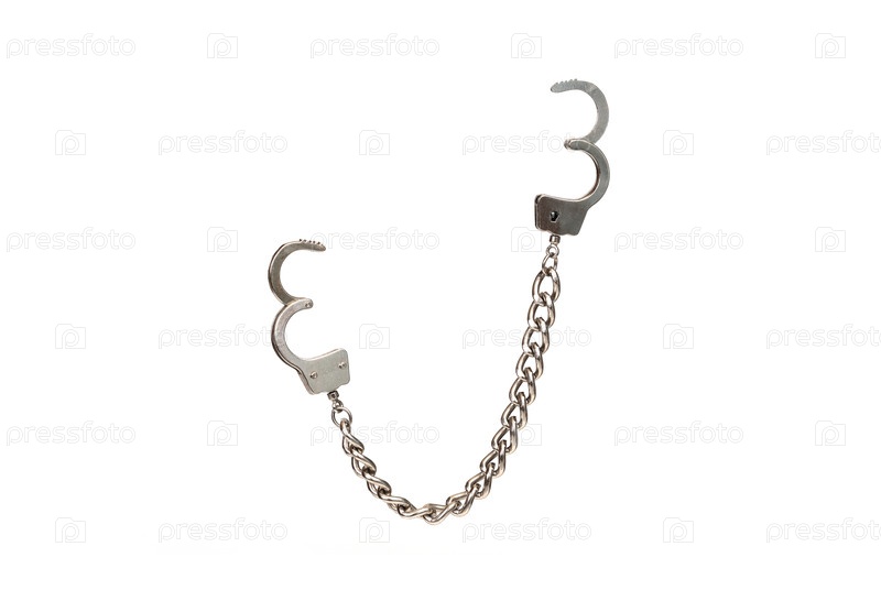 Пара металлических наручников представлена на простом белом фоне