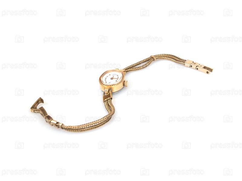 Женские винтажные золотые часы с овальной циферблатами и цепным браслетом изолированы на белом цвете, резка готова. Очень высокое разрешение Золотые винтажные женские часы с овальными циферблатами и цепными браслетами изолированы на белом цвете, резка гот