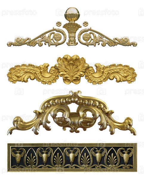Набор золотых декоративных элементов с цветочным узором, выделенным на белом фоне