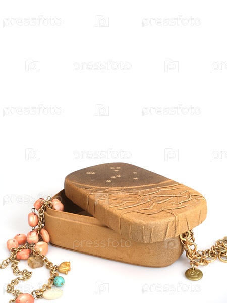 Золотые украшения в коробке из натуральной кожи, изолированной на белом фоне