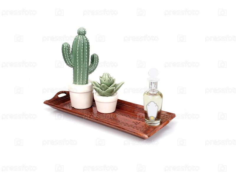 Ручная деревянная резковая декоративная поднос изолирована на белом фоне.На подносе находится натюрморт с керамическими кактусами и ароматом