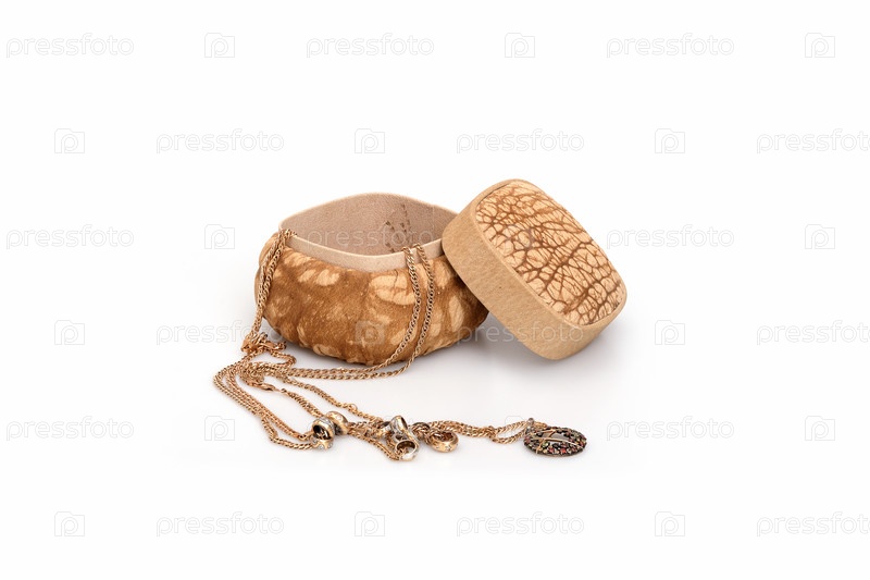 Золотые украшения в коробке из натуральной кожи, изолированной на белом фоне