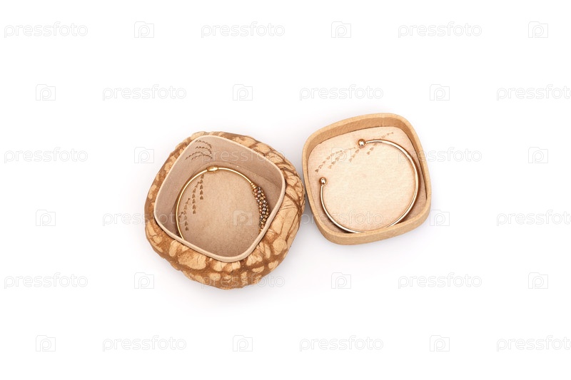 Золотые украшения в коробке из натуральной кожи, изолированной на белом фоне