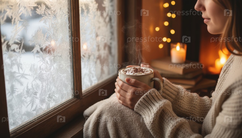 Женщина наслаждается горячим шоколадом возле морозного окна в уютной зимней обстановке со свечами, символизирующими теплый отдых и спокойный сезонный момент в комнате