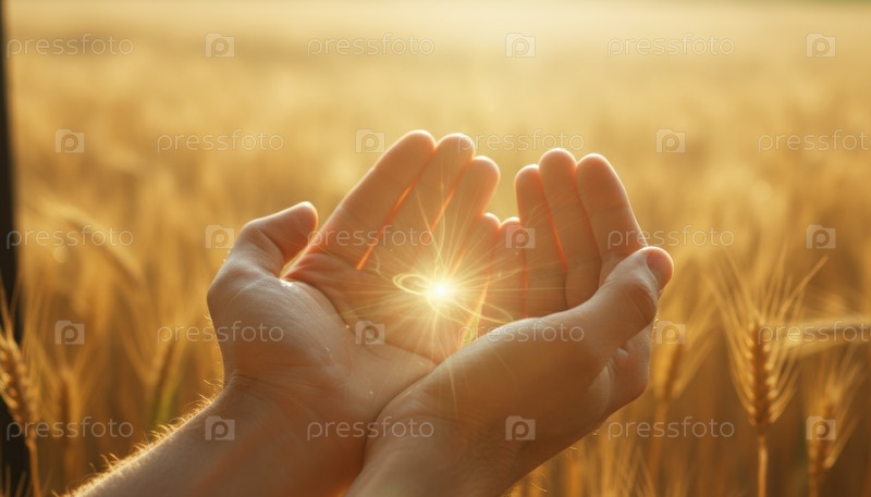Руки, держащие свет на золотом поле, символизируют надежду, устойчивость, возобновляемые источники энергии и гармонию между природой и человеческим творчеством