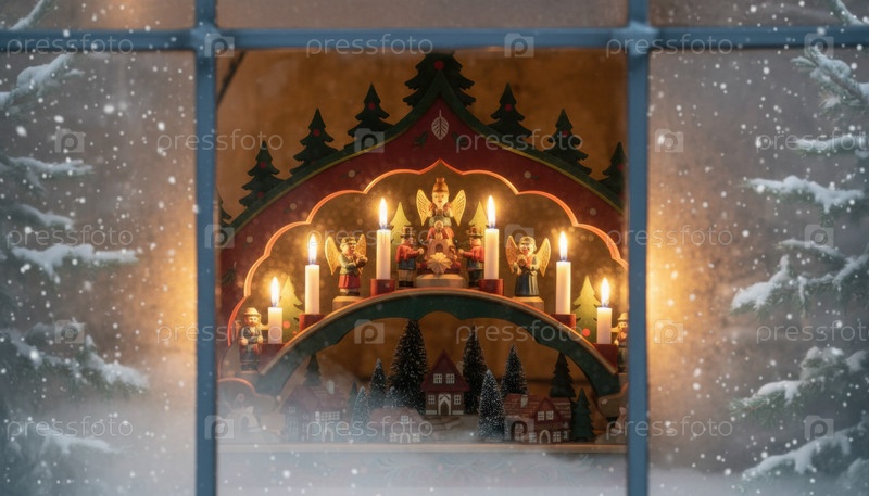 Теплый свет свечей светится от традиционного деревянного Швиббогена в морозном окне, создавая уютную праздничную атмосферу зимней ночью