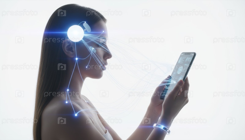 Женщина изучает данные с использованием футуристических нейронных датчиков, чтобы выразить передовые цифровые исследования.Чистая среда подчеркивает новые тенденции в умных технологиях