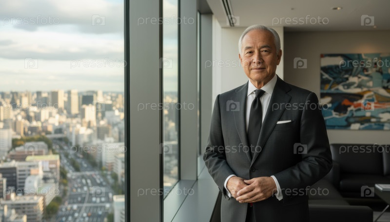 Старший профессионал стоит в высокоразвитом офисе с видом на горизонт города, символизируя опыт лидерства и корпоративное видение, полезное для бизнес-стратегии или идей исполнительного профиля