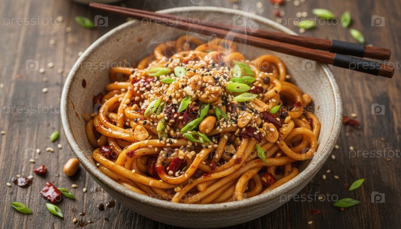 Пикантная миска лапши с кунжутом и чили, демонстрирующая комфорт, энергетический вкус и современную азиатскую кухню, идеально подходит для концепции зимнего комфорта или смелого исследования вкуса