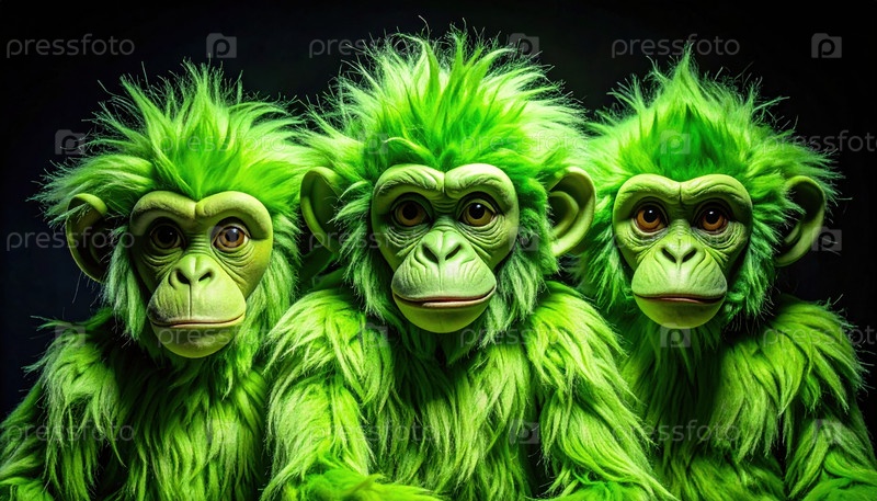 Три ярко-зеленых игрушечных обезьяны сидят вместе на темном фоне, представляя творчество веселого детского воображения и причудливую концепцию дизайна поп-культуры