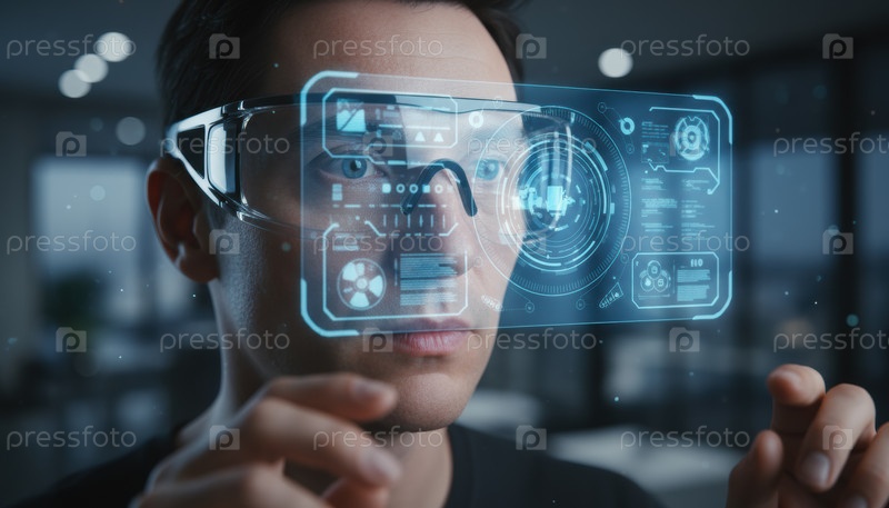 Концентрированный человек изучает голографический дисплей, показывающий данные и технические элементы.Растущая тенденция увеличения рабочего процесса в профессиональной среде