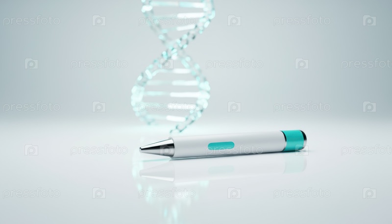 Футуристическое медицинское устройство, помещенное перед спиралью ДНК, символизирует биотехнологические инновации, прогресс в генетических исследованиях и передовые научные разработки