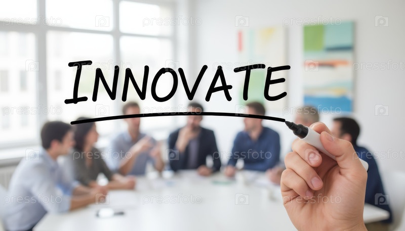 Рука пишет инновации через стекло во время деловой встречи, чтобы выразить новое поколение идей