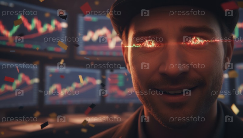 Человек с сияющими глазами празднует торговый успех на фоне экранов графиков рынка, символизирующих триумф, риск и эмоциональную интенсивность сегодняшней финансовой и цифровой культуры спекуляции