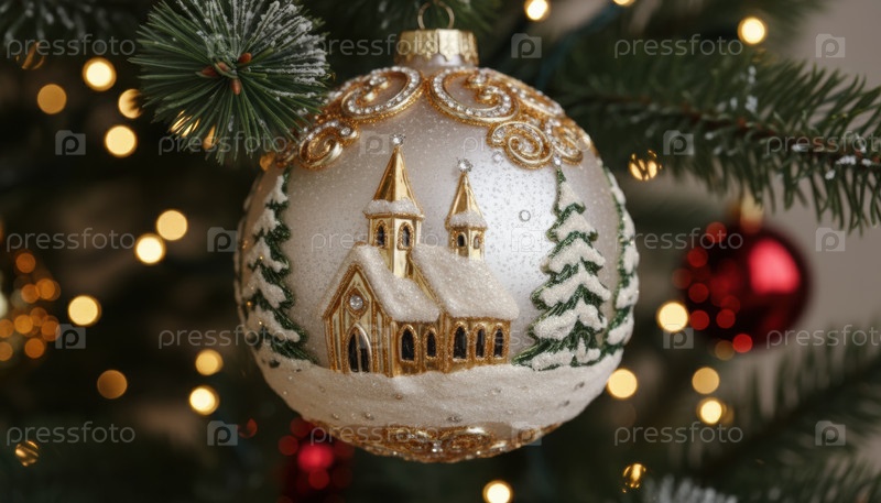 Рождественский орнамент, изображающий заснеженную церковь в окружении ветвей праздничных деревьев, отражает традицию праздничного тепла и ностальгическое очарование зимних торжеств