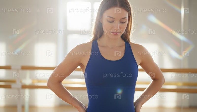 Молодая женщина в фитнес-студии символизирует рутину оздоровления и здоровый образ жизни во время утренней тренировки в ярком интерьере