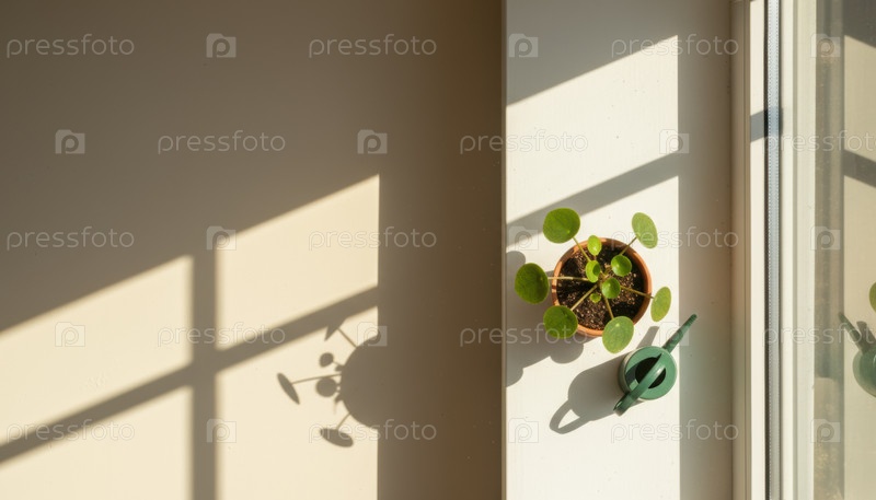 Растение на подоконнике с длинными тенями, представляющими тихую утреннюю домашнюю рутину и современное естественное вдохновение для декора