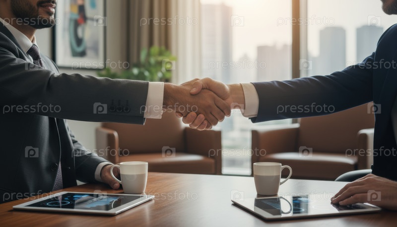Два профессионала, рукопожатые за столом, отражают деловое соглашение, доверие и успешные переговоры в современном офисе